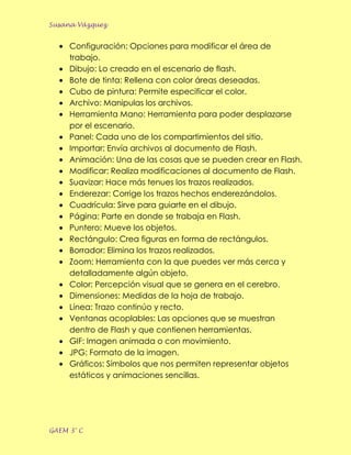 Este documento proporciona una lista de vocabulario técnico relacionado con el software Flash de Macromedia, incluyendo herramientas, comandos, capas, fotogramas y otros elementos esenciales para crear animaciones y películas en Flash.