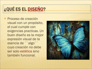 El documento describe los elementos básicos del diseño visual como punto, línea, plano y volumen. Explica que un buen diseño debe cumplir con requisitos prácticos y funcionales, además de ser estéticamente atractivo. Identifica cuatro grupos de elementos de diseño: conceptuales, visuales, de relación y prácticos. Finalmente, discute conceptos como forma, color, textura, estructura y marco para organizar los elementos visuales de manera efectiva.