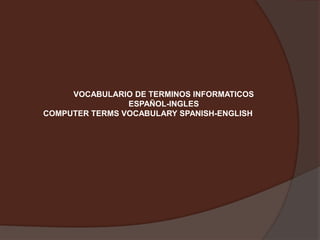Este documento presenta un vocabulario de términos informáticos en español e inglés. Incluye definiciones breves de palabras clave como antivirus, aplicación, bit, chip, computadora, archivo, carpeta, hardware, disco duro, icono, impresora, instalar, placa madre, sistema operativo, programa, software, USB. El documento fue creado por tres estudiantes para su clase de inglés y trata sobre términos básicos de computación.