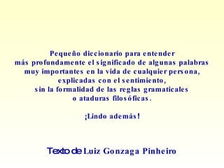 El documento presenta definiciones breves de palabras importantes como amigo, amor, caridad, cariño, celos, entre otras. Las definiciones exploran el significado emocional y espiritual de las palabras más que su significado literal o filosófico. La mayoría se enfocan en cómo estas palabras se relacionan con sentimientos del corazón y las conexiones entre las personas.