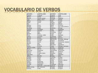 Este documento presenta una lista de vocabulario en quechua con términos relacionados al hogar, la escuela, el cuerpo, la naturaleza y la comunidad. Incluye palabras para describir objetos del hogar como chicha, casa, cuarto y fogón, así como términos escolares como lápiz, tiza y libro. Además, contiene nombres de animales como perro, gato y gallina, y conceptos de la naturaleza como río, selva y estrellas. Por último, presenta vocabulario comunitario con