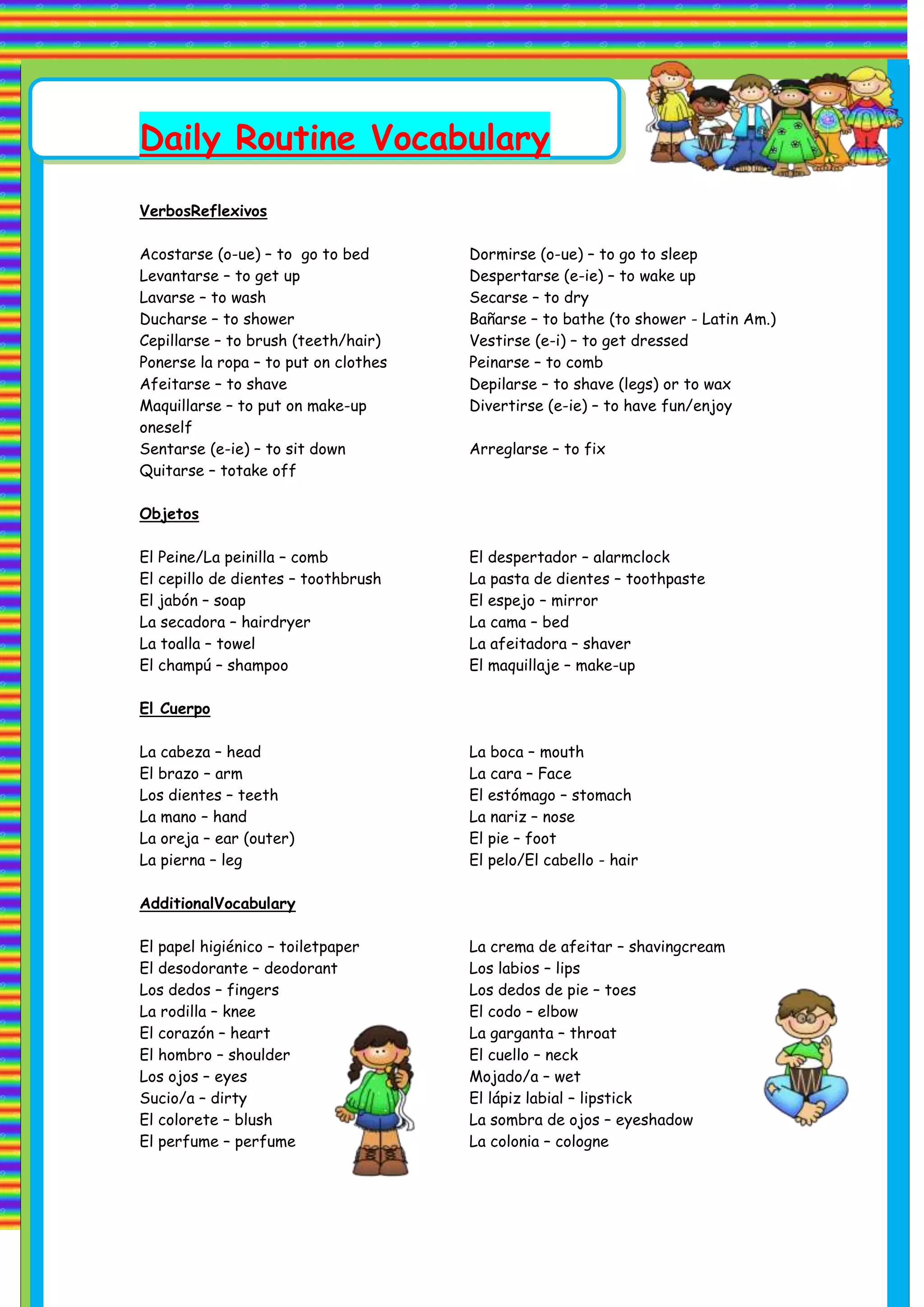 Este documento presenta vocabulario en español relacionado con la rutina diaria. Proporciona verbos reflexivos como acostarse, dormirse y levantarse. También incluye objetos como el cepillo de dientes, el espejo y la cama. Además, enumera partes del cuerpo como la cabeza, la boca y los brazos. Finalmente, ofrece vocabulario adicional como el papel higiénico, el desodorante y productos de maquillaje.