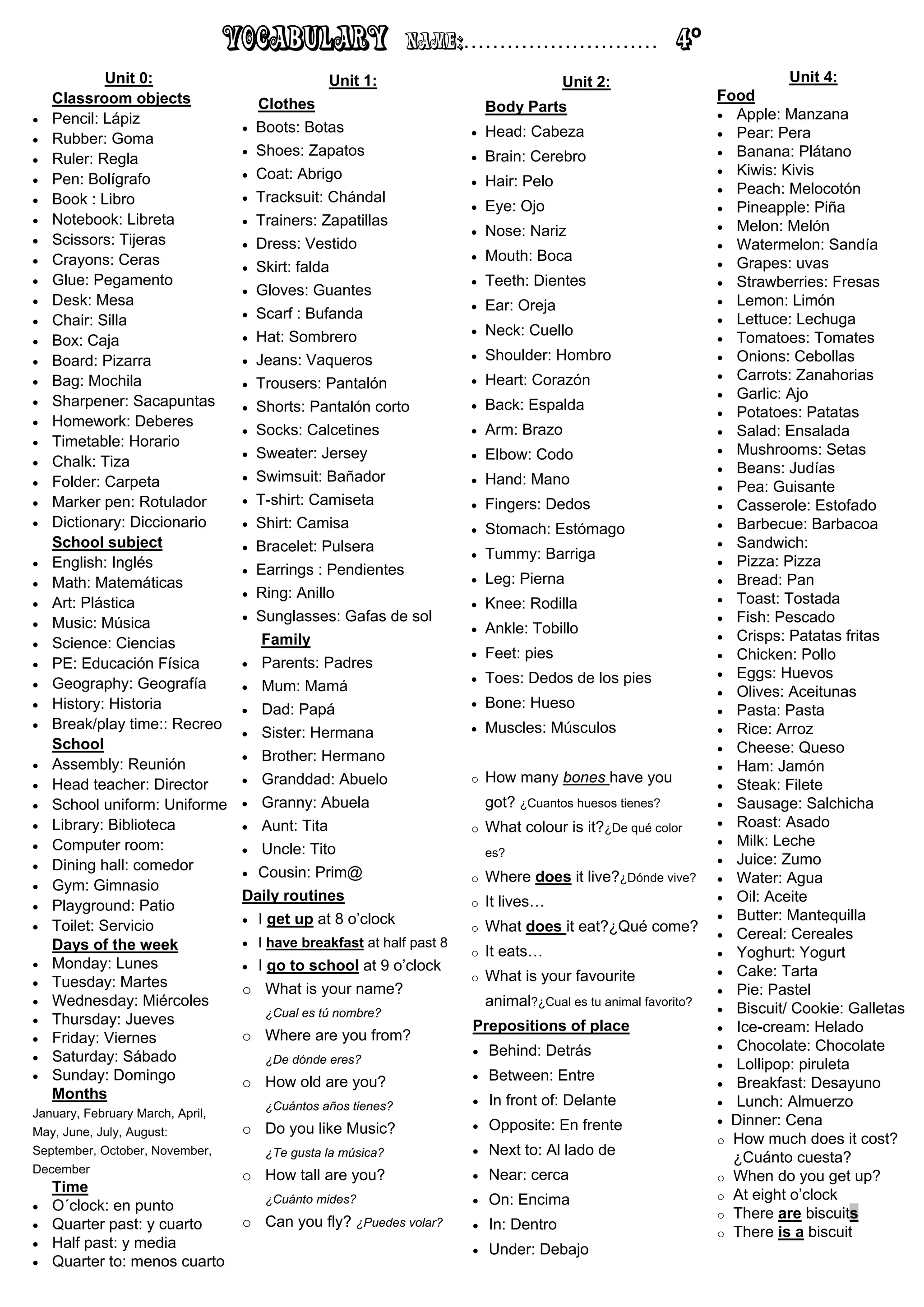 Este documento presenta una lista de vocabulario en inglés organizado en unidades temáticas como objetos de la escuela, partes del cuerpo, animales, profesiones, deportes, verbos y colores. Incluye términos comunes relacionados con cada tema, como lápiz, libro, cabeza, mano, oso, médico, correr, rojo, verde y negro. El vocabulario está destinado a estudiantes de inglés como lengua extranjera en el nivel 4o de primaria.