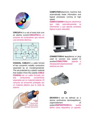 Este documento proporciona definiciones concisas de varios términos relacionados con la tecnología y la electricidad. Define palabras como antivirus, batería, interruptor, cable, computadora, dispositivo, hardware, software, virus y voltaje. El documento busca explicar brevemente el significado y función de estos componentes y conceptos tecnológicos básicos.