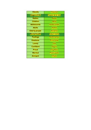 Este documento presenta una lista de vocabulario en inglés y español relacionado con la salud y los hábitos saludables para niños de 3er grado de primaria. La lista incluye términos como "saludable", "no saludable", "hábitos saludables", partes del cuerpo como "dientes" y "manos", actividades como "hacer ejercicio" y "dormir", tipos de alimentos como "fruta", "verduras" y "productos lácteos", y problemas de salud como "catarros", "