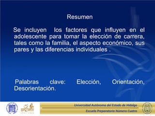 El documento describe los factores que influyen en la orientación vocacional de los adolescentes, incluyendo la familia, los amigos, las diferencias individuales y factores socioeconómicos. Se mencionan específicamente la profesión familiar, la influencia de los amigos, gustos e intereses personales como factores importantes en la elección de una carrera.