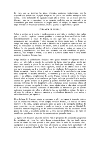 Este documento describe las dinámicas sociales que ocurren en el pasillo de un colegio público en Bogotá a través de las observaciones de un docente. El pasillo se ha convertido en un espacio de encuentro donde los estudiantes interactúan y establecen jerarquías. También se ven comportamientos como pandillas juveniles basadas en barras de fútbol, burlas a estudiantes homosexuales, y actividades delictivas como robo o consumo de drogas planeadas en este espacio entre clases.