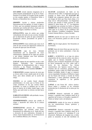 Este documento describe diversos términos relacionados con la geografía física de España. Explica conceptos como acantilados, albuferas, cordilleras, deltas, glaciares, istmos, macizos antiguos, relieves kársticos y otros accidentes geográficos. Además, define tipos de mapas como los físicos y topográficos que representan el territorio español.