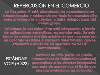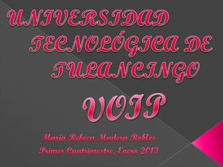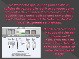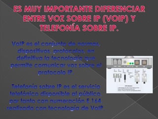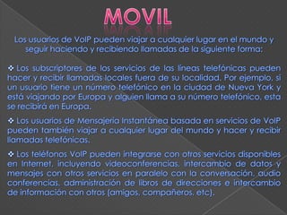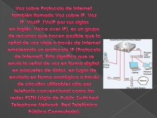 El documento describe las funciones de VoIP y sus ventajas sobre las redes telefónicas tradicionales. VoIP permite codificar y transmitir llamadas de voz a través de Internet en lugar de redes telefónicas, facilitando llamadas locales y gratuitas independientemente de la ubicación. También proporciona servicios adicionales como llamadas múltiples y identificación de llamadas. VoIP es independiente del hardware y permite la integración de video, comercio electrónico y acceso a la red telefónica tradicional.