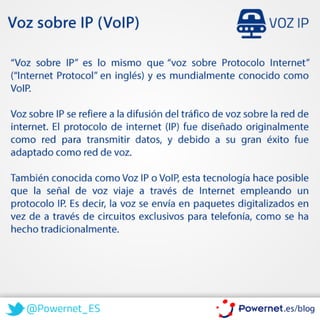VoIP se refiere a la transmisión de voz a través de Internet usando protocolos IP en lugar de circuitos dedicados. Permite integrar comunicaciones de voz y datos en una sola red, reduciendo costos. Se requiere una conexión de banda ancha y equipos compatibles como teléfonos IP, adaptadores o software de voz en la computadora.