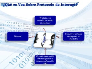 El documento describe la tecnología VoIP (Voz sobre IP), explicando que convierte señales de audio analógicas en digitales para transmitir datos digitales a través de Internet. Menciona que VoIP permite llamadas gratuitas y a larga distancia reduciendo costos, y ofrece cobertura mundial con conexión a Internet. También señala algunas ventajas de VoIP como su independencia del hardware, integración con redes IP y videoconferencia, así como desventajas como posibles retrazos, deterioro de la comunicación y costos adicional