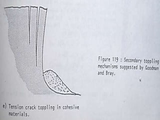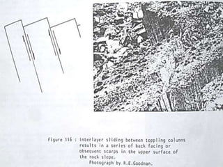 Este documento presenta información sobre diferentes tipos de fallas por volcamiento en rocas, incluyendo volcamiento flexural, volcamiento de bloque y volcamiento flexural de bloque. Describe los mecanismos y características geométricas de cada tipo de falla. También menciona el uso de modelos computacionales y físicos de bloques para simular y estudiar el comportamiento de fallas por volcamiento.