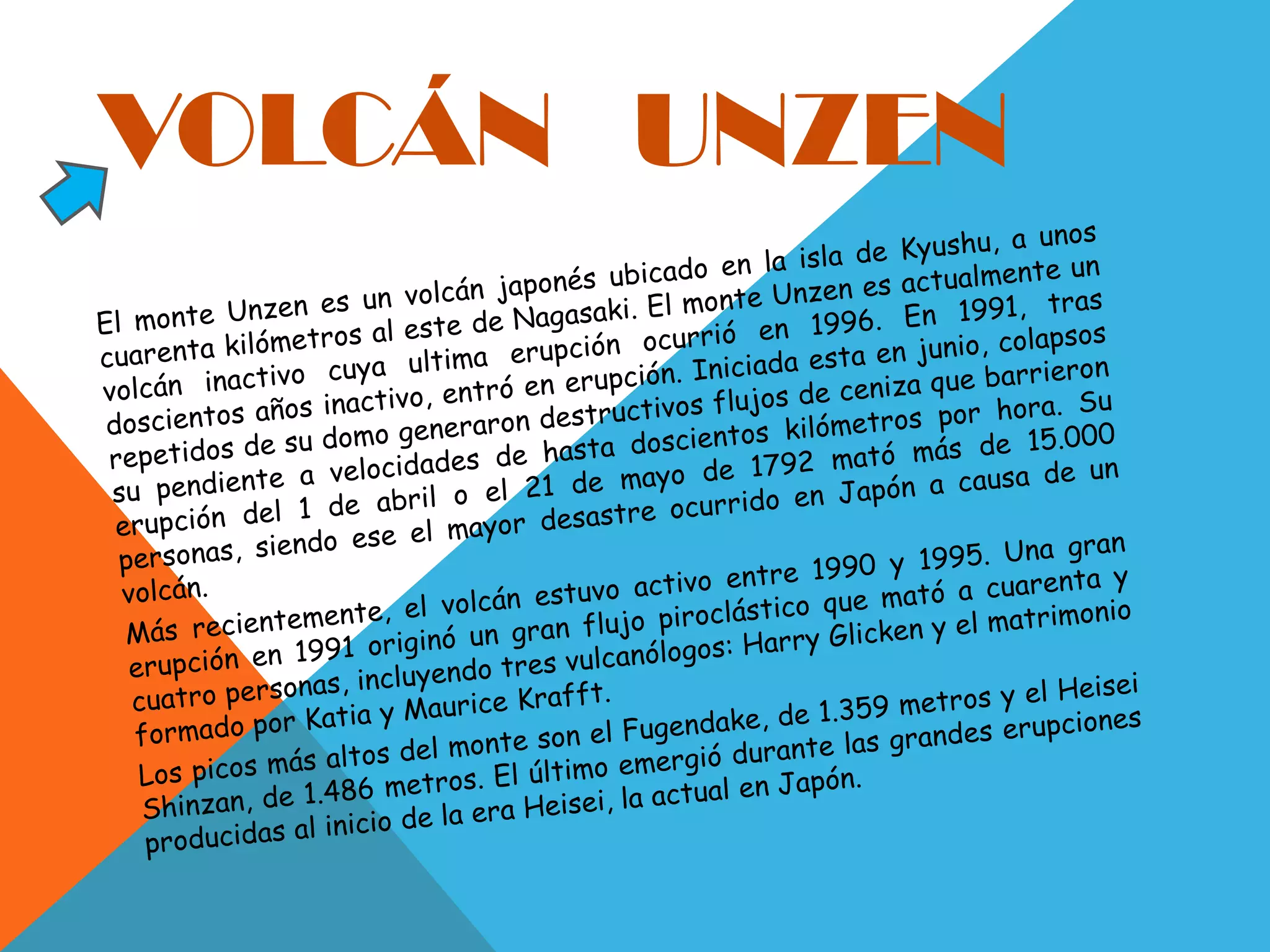 El monte Unzen es un volcán inactivo ubicado en Japón que tuvo su última erupción en 1996. En 1991, tras doscientos años de inactividad, entró en erupción generando flujos de ceniza que mataron a 44 personas, incluyendo a 3 vulcanólogos. Sus picos más altos son el Fugendake de 1,359 metros y el Heisei Shinzan de 1,486 metros.