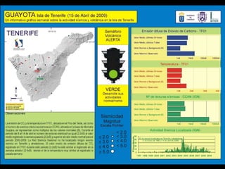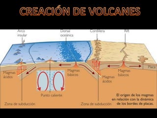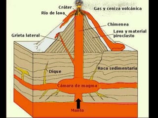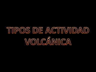Este documento describe dos tipos de actividad volcánica, efusiva y explosiva. La actividad efusiva se caracteriza por lava muy fluida y sin acumulación de gases ni explosiones, mientras que la actividad explosiva presenta lava viscosa que favorece la acumulación de gases y fuertes explosiones con piroclastos. También menciona algunos peligros asociados a la actividad volcánica como gases tóxicos, nubes ardientes, lahares y erupciones históricas.