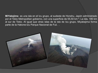 MiYakejima es una isla japonesa ubicada al sureste de Honshu que forma parte del Parque Nacional Fuii. La isla fue evacuada en 2000 debido a la erupción del Monte Oyama, aunque los residentes pudieron regresar en 2005. La Subprefectura de Miyake, a la que pertenece administrativamente, incluye las villas de Miyake y Mikurajima.