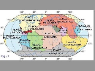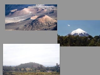 El documento proporciona información sobre diferentes tipos de volcanes como estratovolcanes, volcanes con caldera y volcanes hawaianos. También describe los productos volcánicos como lava, gases y piroclastos, y zonas del mundo donde se encuentran volcanes activos como la zona circumpacífica y la zona asiático-mediterránea. Finalmente, incluye tablas con los nombres y alturas de los principales volcanes de Europa, Asia, África, América y la Antártida.