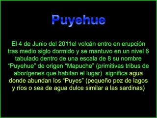 El volcán Puyehue en Chile entró en erupción en junio de 2011 después de 50 años de inactividad, emitiendo cenizas que afectaron amplias áreas de Chile y Argentina, dañando la agricultura, el turismo y causando problemas de salud. Las cenizas continuaron propagándose por varios días y países, interrumpiendo los vuelos aéreos.