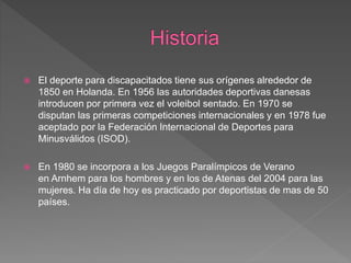El voleibol sentado se originó en Holanda en 1850 y fue introducido formalmente en los Juegos Paralímpicos en 1980. Se juega de forma similar al voleibol convencional pero requiere que los jugadores permanezcan sentados en todo momento. Los equipos consisten en seis jugadores cada uno y compiten en una cancha dividida por una red para enviar el balón al campo contrario sin exceder los tres toques.