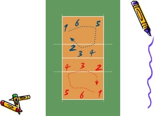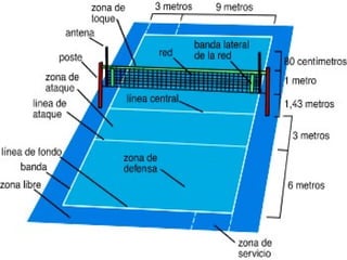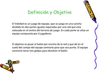 El voleibol es un deporte de equipo que se juega entre dos equipos de seis jugadores separados por una red. El objetivo es pasar el balón por encima de la red para que caiga en el campo del equipo contrario y marque un punto. Los jugadores usan diferentes técnicas como el saque, remate, bloqueo y pase para tratar de anotar puntos sobre el equipo contrario. Se juega al mejor de cinco sets, ganando el equipo que gane tres sets. Existen varias modalidades de voleibol como la playa y la