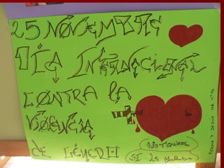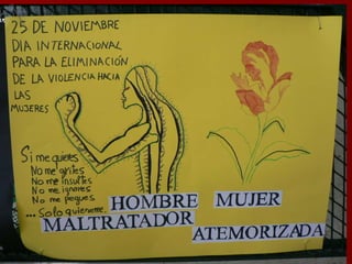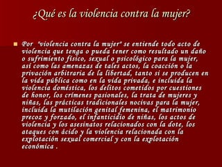 El documento trata sobre la violencia de género. Define la violencia contra la mujer y ofrece datos sobre el perfil de los agresores encarcelados en España, donde representan el 5,7% de la población penitenciaria. También menciona el matrimonio forzado de 450 niñas menores de 10 años en Gaza con hombres del doble de su edad, autorizado por Hamas.