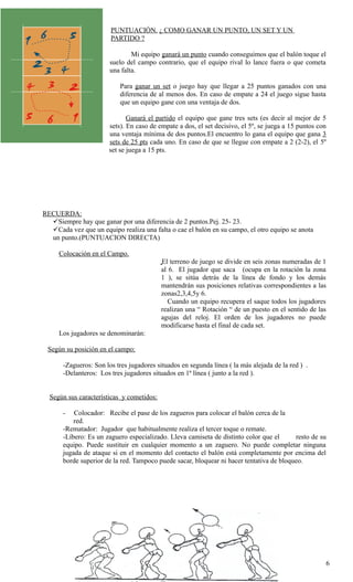 El documento resume las reglas y técnicas básicas del voleibol. El voleibol es un deporte de equipo en el que dos equipos se enfrentan a través de una red para golpear un balón y hacer que caiga en el campo contrario. Cada equipo tiene derecho a tres toques antes de devolver el balón. Los jugadores adoptan posiciones específicas y usan técnicas como recepción, colocación, remate y bloqueo. El objetivo es anotar puntos haciendo que el balón caiga en el campo contrario