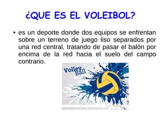 El voleibol es un deporte donde dos equipos se enfrentan a través de una red central tratando de pasar el balón al suelo del otro equipo. La red mide 1 metro de ancho y entre 9 y 10 metros de largo. El balón es más pequeño que los de baloncesto o fútbol, entre 65-68 cm de circunferencia. Cuando un equipo anota, los jugadores rotan sus posiciones en el campo en sentido de las agujas del reloj.