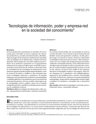 Este documento analiza cómo las tecnologías de información afectan las relaciones de poder entre clientes y proveedores en el cluster automotriz de Volkswagen en Puebla, México. Presenta el caso de Johnson Controls, un proveedor, y cómo Volkswagen usa sistemas electrónicos para controlar la comunicación de información. Aunque las tecnologías parecen facilitar la cooperación, en realidad refuerzan una red centralizada donde Volkswagen mantiene el poder sobre recursos valiosos como contratos y estándares. Así, las tecnologías son instrumentos de