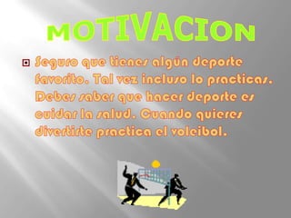 Este documento clasifica los deportes en varias categorías, incluyendo deportes atléticos, de pelotas, de combate, de motor, náuticos, de deslizamiento, individuales y colectivos. También menciona deportes de aventura, juegos y deportes de inteligencia. El voleibol se menciona como un deporte de pelota que puede practicarse para divertirse y cuidar la salud.