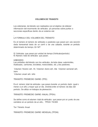 Este documento describe los conceptos clave relacionados con el volumen de tránsito. Explica que el volumen de tránsito mide el número de vehículos u personas que pasan por un punto específico en un período de tiempo determinado. Define la fórmula para calcular el volumen de tránsito y describe cómo se miden las unidades de volumen de tránsito, incluido el tránsito promedio diario anual y mensual. También explica la importancia de entender las variaciones en los volúmenes de tránsito a lo largo