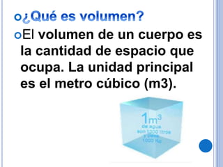 El documento explica brevemente cómo calcular volúmenes y define los términos volumen y capacidad. Define el volumen como la cantidad de espacio que ocupa un cuerpo y su unidad principal es el metro cúbico. Además, define la capacidad como la cantidad que cabe dentro de un recipiente.