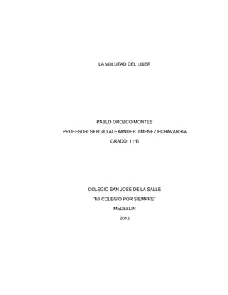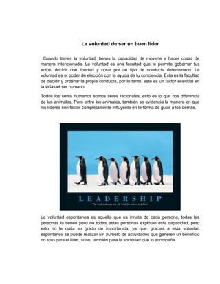 El documento describe la importancia de la voluntad para ser un buen líder. Explica que la voluntad es la capacidad de tomar decisiones y elegir cómo comportarse. También discute que la voluntad espontánea y consciente son importantes para los líderes, y que obtener voluntad es necesario para alcanzar objetivos y guiar efectivamente a otros. Concluye que los líderes buscan beneficios para todos, no solo para sí mismos, y que se requiere una voluntad fuerte para liderar a un grupo.