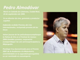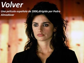 Volver es una película española de 2006 dirigida por el famoso director Pedro Almodóvar. La película compitió en el Festival de Cannes de 2006 donde ganó dos premios, mejor actriz y mejor guión. Penélope Cruz fue nominada al Oscar por su papel principal en la película. La película trata sobre Raimunda, una mujer casada que vive con su hija adolescente y su esposo desempleado, y su hermana Sole, y lidia con la aparición del espíritu de su madre fallecida.