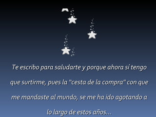 El autor le escribe a Dios para pedirle que le envíe nuevos recursos para reemplazar los que se le han agotado a lo largo de su vida, como la paciencia, la tolerancia y la fe. Solicita que le envíen frascos llenos de paciencia y tolerancia, así como cursos sobre prudencia, bolsas de madurez, sonrisas, una brújula, imaginación, ilusiones, fe, esperanza, colores y otros elementos para mejorar su vida.