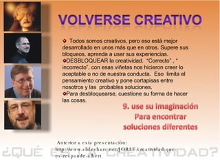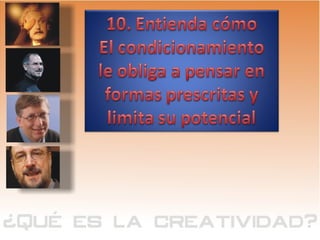 La creatividad es una habilidad que todos poseen en diferentes grados y puede potenciarse al superar bloqueos y cuestionar normas establecidas. Para tener éxito a largo plazo, es crucial mantener la mente abierta, conectar ideas y generar nuevas soluciones sin temor a lo impensable. Preguntar y desafiar suposiciones son prácticas fundamentales para desbloquear el pensamiento creativo.