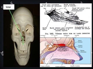 El vómer es un hueso impar, cuadrangular y delgado que forma el tabique de las fosas nasales. Se compone de dos caras planas y cuatro bordes: el borde superior se abre en forma de ángulo, el borde inferior es delgado y rugoso, y el borde posterior es delgado y afilado.