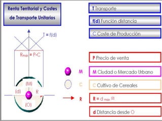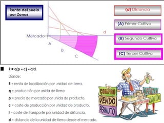El documento resume la teoría del espacio agrario de Johann von Thünen, quien estudió el funcionamiento de un mercado agrícola vinculado a un núcleo urbano. Analizó el comportamiento de una economía rural de subsistencia y una economía comercial basada en intercambios campo-ciudad. Von Thünen propuso un modelo donde calculaba las rentas agrícolas en función de factores como la producción, fertilidad de la tierra y distancias al mercado, representando el espacio como coronas concéntricas dedicadas a diferentes cult