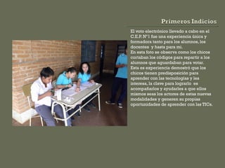 Los estudiantes participaron en una votación electrónica utilizando códigos de votación asignados. Los estudiantes cortaban los códigos y los distribuían a sus compañeros que esperaban para votar utilizando netbooks. La experiencia demostró que los estudiantes están dispuestos a aprender con tecnologías cuando se les guía y permite participar activamente.
