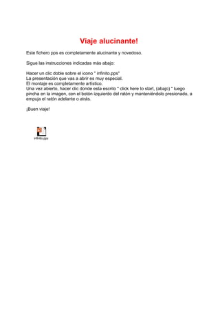 Las instrucciones indican que al hacer doble clic en el icono "infinito.pps" se abrirá una presentación artística y especial. Al hacer clic donde dice "click here to start" y mantener presionado el botón izquierdo del ratón, se puede mover el ratón hacia adelante o atrás para navegar por la presentación de manera alucinante.
