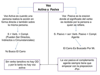 El documento describe la diferencia entre la voz activa y pasiva en español. La voz activa ocurre cuando el sujeto realiza la acción directamente, mientras que la voz pasiva ocurre cuando el sujeto recibe la acción realizada por otro agente, el cual se indica con la preposición "por".