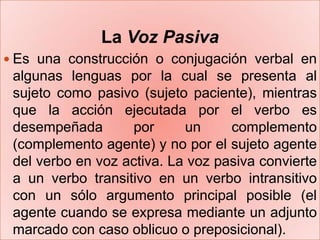 Este documento describe la voz pasiva en español. Explica que la voz pasiva convierte al sujeto en paciente y la acción en algo recibida en lugar de realizada. Detalla las características y estructura de la voz pasiva, incluyendo el uso del verbo auxiliar "ser" y el participio pasado del verbo principal. También cubre cómo cambiar una oración activa a pasiva y las reglas gramaticales asociadas con la voz pasiva.