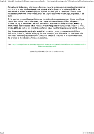 El Ministerio de Fomento planea liberalizar el ferrocarril español en 2014 permitiendo que empresas privadas operen trenes por primera vez en 72 años. Se concederán licencias a tres empresas inicialmente para operar en toda la red, aunque su principal interés es la alta velocidad. Renfe competirá dividiéndose en cuatro sociedades, una de las cuales alquilará material ferroviario a las empresas privadas. Francia y Alemania podrían solicitar licencias para operar en España, especialmente en las líneas de alta velocidad más rentables.