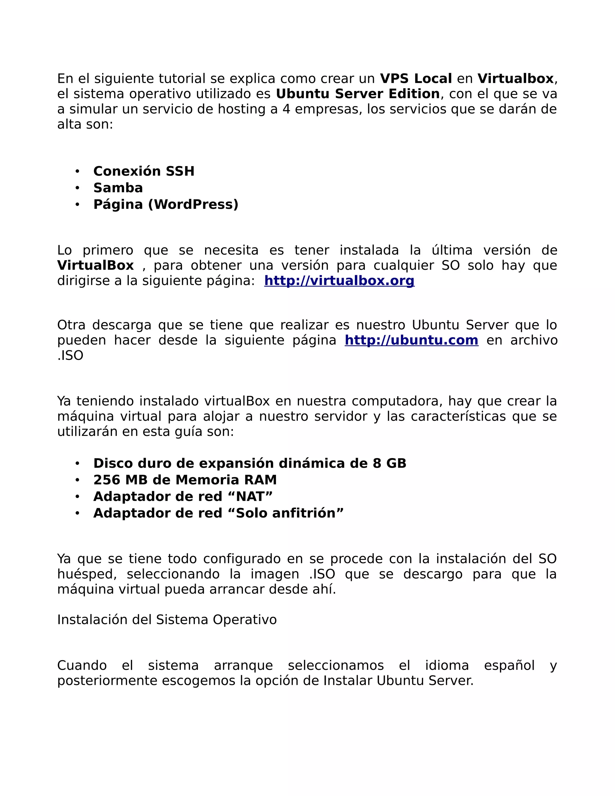 Este documento proporciona un tutorial detallado sobre cómo crear y configurar un VPS local utilizando VirtualBox y Ubuntu Server Edition. Incluye pasos para la instalación del sistema operativo, configuración de servicios como SSH, Samba y WordPress, así como la creación de usuarios y bases de datos. También se explican los procedimientos para establecer una red y gestionar la instalación de software adicional para obtener un servicio de hosting para múltiples empresas.