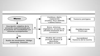 Este documento describe los diferentes tipos de vértigo, incluyendo vértigo periférico y central. El vértigo periférico se debe a problemas en el oído interno o nervio vestibular y representa el 85% de los casos. El vértigo central se debe a problemas en el tronco encefálico y representa el 15% restante. La exploración física incluye exámenes del oído, nistagmo, pruebas de equilibrio como Romberg, y pruebas posicionales como la maniobra de Hallpike. El