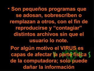 Los virus son pequeños programas que se adhieren a otros archivos para reproducirse sin que el usuario lo note. Un virus no puede dañar hardware y solo puede activarse si el usuario ejecuta el archivo infectado. Existen varios tipos de virus como boot, de archivo y macro virus que infectan sistemas de diferentes formas y pueden tener efectos como infección de archivos, modificación del sistema operativo o pérdida total de datos.