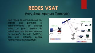 Este documento describe las características de una red VSAT (Very Small Aperture Terminal). Una red VSAT conecta una estación central llamada Hub con múltiples estaciones remotas a través de un satélite. Las redes VSAT son privadas, personalizadas y proporcionan ancho de banda suficiente para voz, datos y video. Están compuestas por terminales remotos VSAT, un Hub más grande y un segmento espacial satelital.