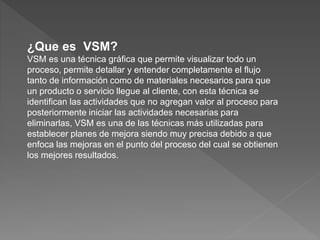 El documento describe los pasos para realizar un mapeo de valor (VSM). Estos incluyen: 1) identificar las familias de productos, 2) dibujar el estado actual del proceso e identificar inventarios, 3) analizar la visión del estado futuro, 4) dibujar el VSM futuro, y 5) plasmar un plan de acción e implementar cambios para alcanzar el estado futuro. El propósito del VSM es identificar desperdicios y fuentes de mejora para establecer procesos vinculados con los clientes y basados en la demanda.