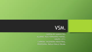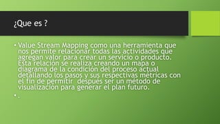El documento describe Value Stream Mapping (VSM) como una herramienta para mapear el flujo de valor en un proceso productivo, identificando actividades que agregan o no valor. VSM permite visualizar el flujo de materiales e información actual y planear un estado futuro más eficiente. Se usa para eliminar desperdicios mediante la identificación de cuellos de botella, inventarios excesivos, y otras ineficiencias.