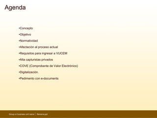 La Ventanilla Única de Comercio Exterior Mexicana (VUCEM) es una herramienta electrónica que permite a los usuarios realizar trámites de importación y exportación enviando la información una sola vez a través de un punto de entrada electrónico. El objetivo de VUCEM es simplificar y automatizar los procesos aduaneros mediante la digitalización de documentos y el uso de un pedimento electrónico. Los usuarios deben contar con firma electrónica avanzada, estar registrados en el sistema y digitalizar documentos como facturas