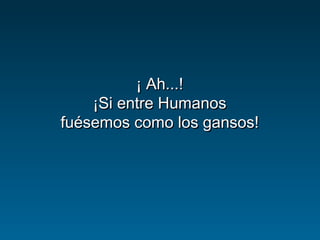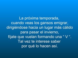 Este documento presenta cinco lecciones que se pueden aprender de los gansos que vuelan en formación de "V". 1) Trabajar juntos permite llegar más rápido al destino compartiendo la carga. 2) Permanecer unidos hace que el esfuerzo sea menor y más placentero. 3) Es importante compartir el liderazgo y respetarse mutuamente. 4) Dar ánimo y apoyo mejora el progreso. 5) Mantenerse unidos en los momentos difíciles y de esfuerzo.