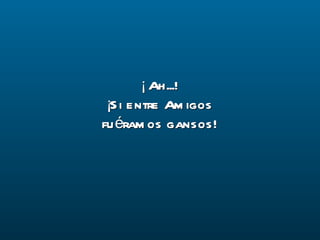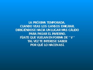 El documento hace una analogía entre las bandadas de gansos que migran juntas y la amistad entre personas. Explica que los gansos vuelan en formación de V para aprovechar la reducción de resistencia del aire y aumentar su alcance. También comparten el liderazgo, se ayudan mutuamente cuando alguno se cansa o está herido, y se mantienen unidos para superar las dificultades juntos. La lección es que la amistad y el trabajo en equipo hacen que los objetivos sean más fáciles de alcanzar y